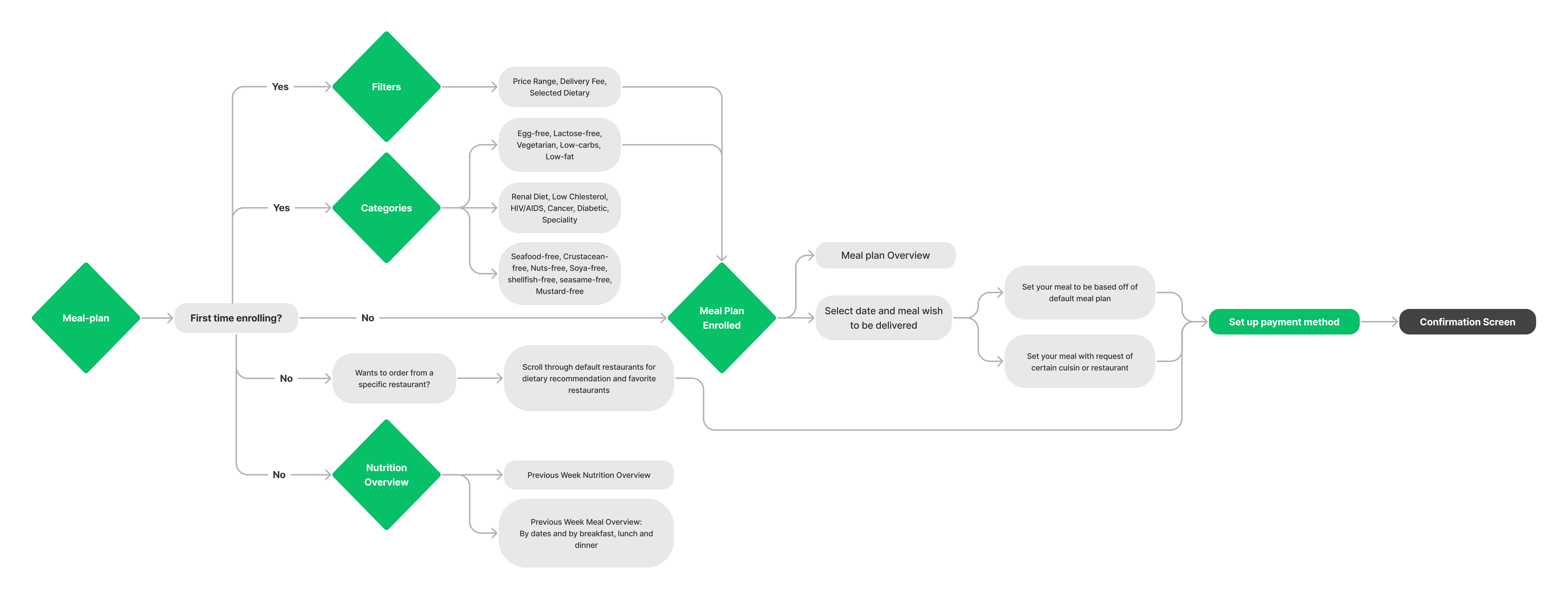 Creating the user flow for the platform required a full understanding of the meal plan delivery process and the complexity between users from two generations. This was made possible by identifying and addressing the key pain points through interviews and research. The following site map is an example that depicts a smooth user flow, illustrating how a user navigates through the pages and information to reach their ultimate destination of ordering a meal plan delivery.
